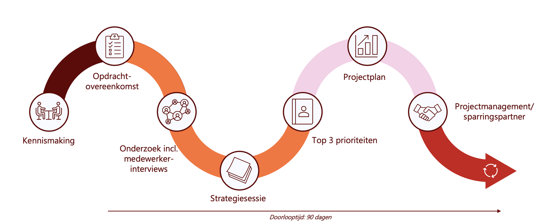 Een onderzoeksfase waarin we de top drie grootste thema's op personeels-gebied identificeren. Dit doen we door een vragenlijst, vijf interviews met directie/MT-leden, en een strategiesessie.
